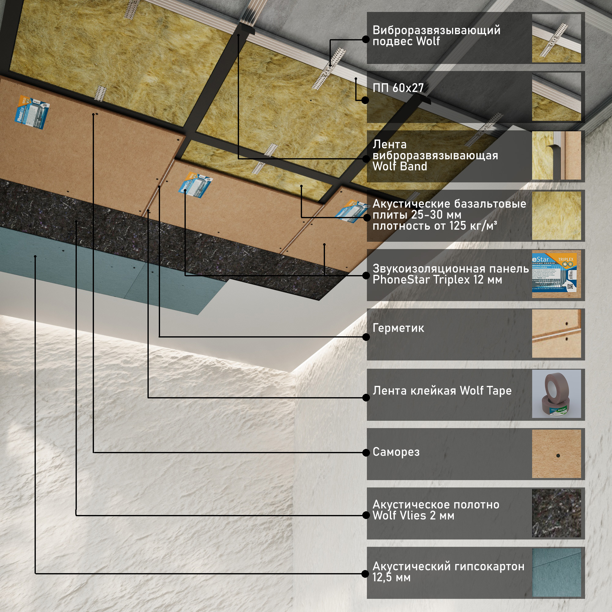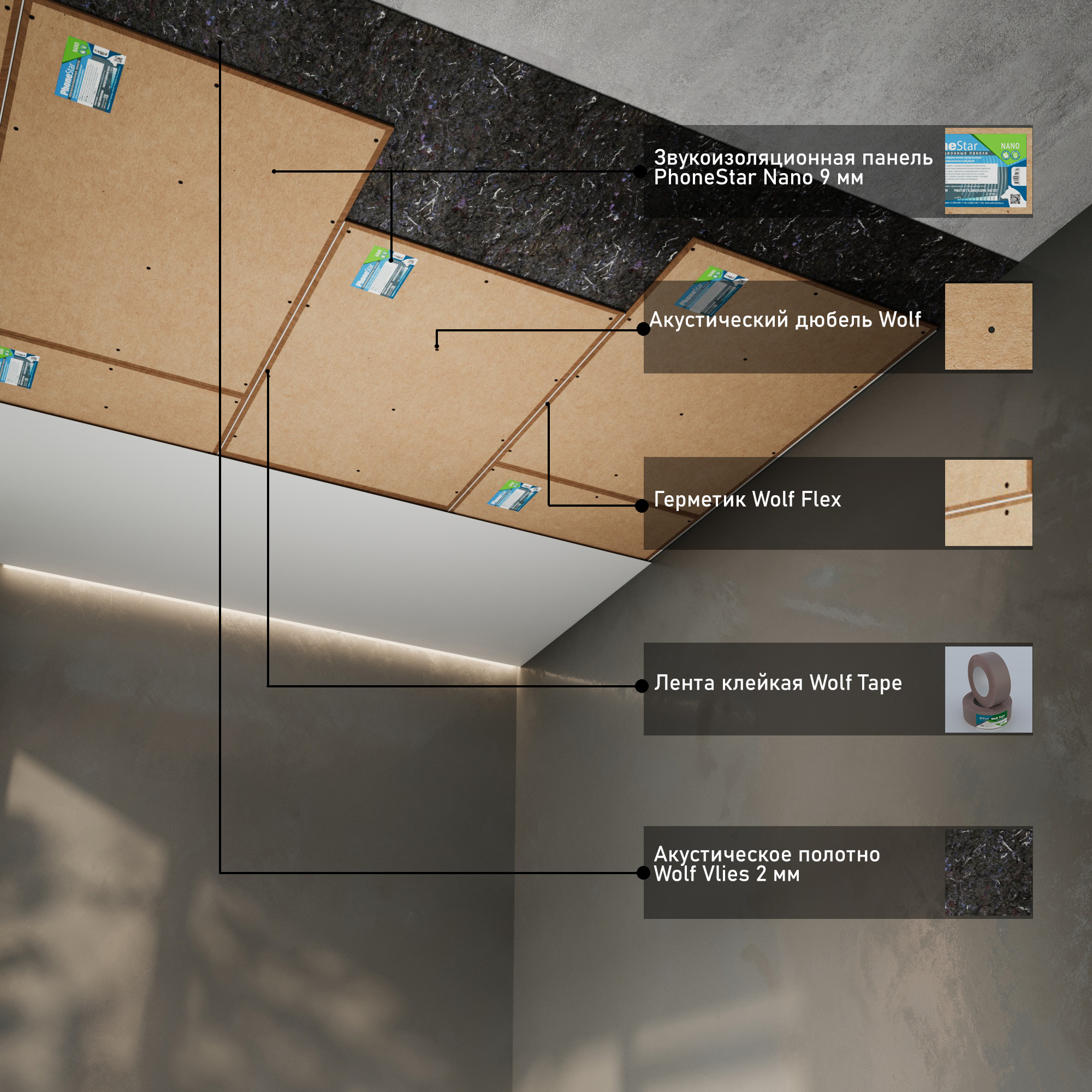 Главным элементом системы является тонкая, но тяжелая панель PhoneStar Triplex толщиной 12 мм, предупреждающая распространение воздушного и структурного шума.